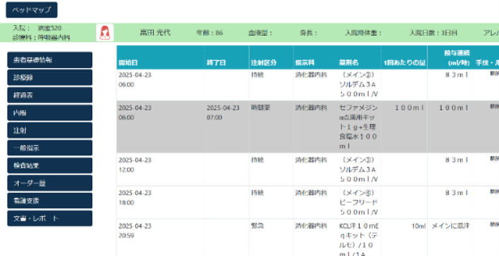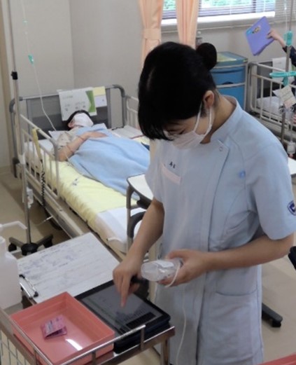 4月23日(金)に「臨床看護の実践 ハイリスク状況下での事故防止」という校内実習で教育用電子カルテを導入しました。2名の患者さんを受け持ちながら、臨床現場に潜む様々な危険を予測しながら安全に注射薬を投与するという内容でした。医師の指示を電子カルテで確認し、臨機応変な対応を実践していくことは非常に緊張感があり、臨床現場さながらの雰囲気を感じながらの学習となりました。事例では、急な腹痛の出現に対して、医師からの緊急注射指示を理解し、準備・投与するという内容でした。学生からは「実習で使用している電子カルテと同じだったので、まるで臨床現場で実際に働いているかのようなリアルな学びができた気がします」という感想がありました。このような緊急時の対応は病院での臨地実習で経験することは難しいため、学内の校内実習で経験できたことは看護実践力の向上につながったと思います。これからも多くの科目で教材のDX化を進めていき、効果的な学習につなげていきたいと思います。