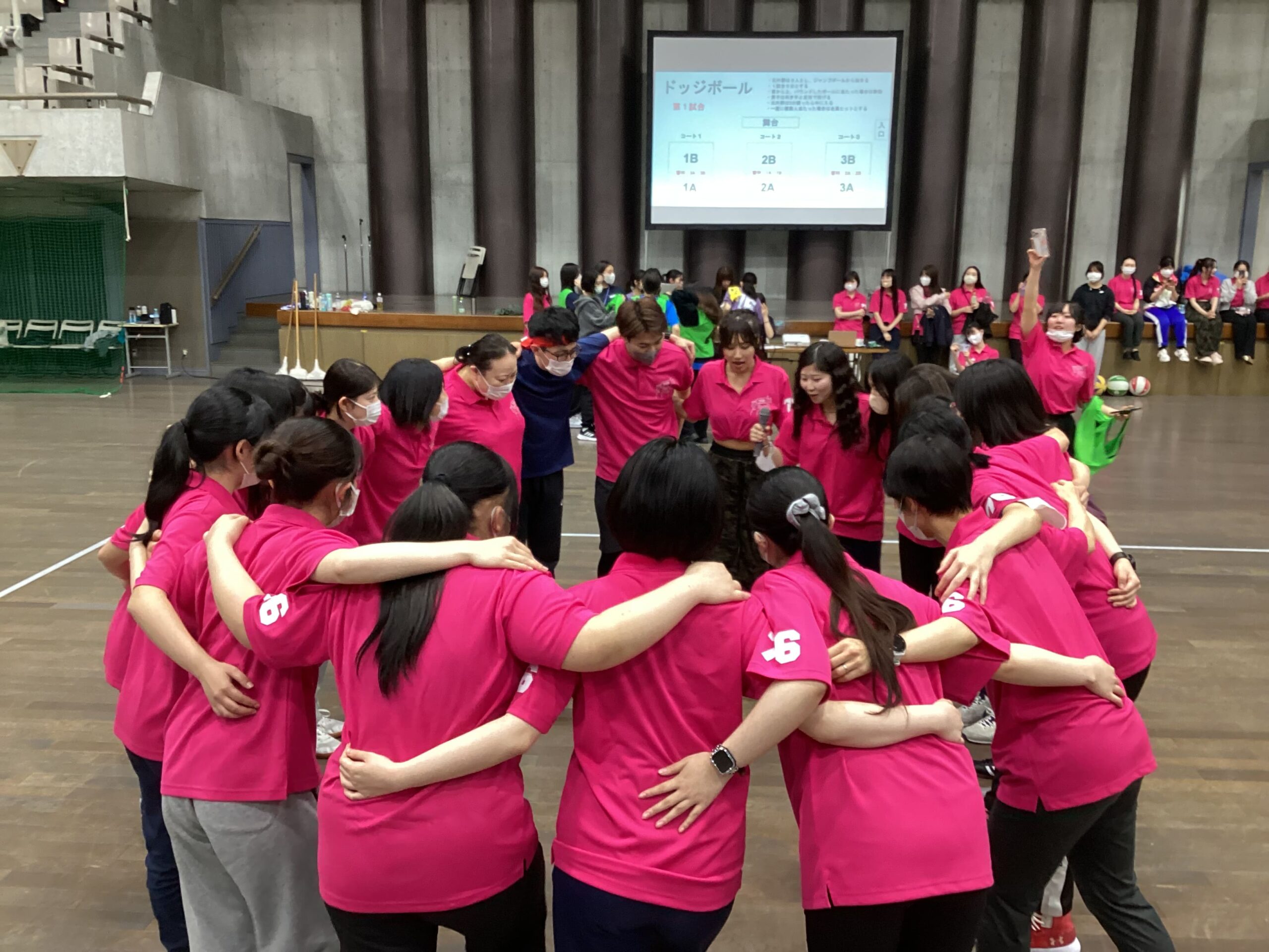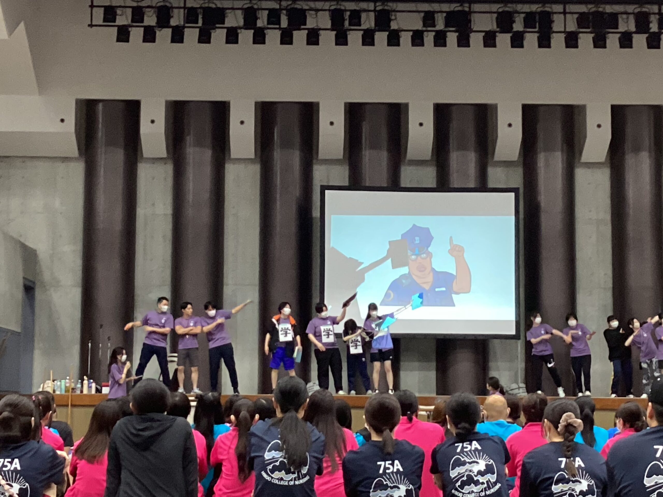 広尾看護専門学校では、令和7年4月25日(金曜日)に、東京武道館で体育祭を開催しました。当校の体育祭は、全学生と教職員が参加し、新入生歓迎会も兼ねて行います。新入生歓迎会では、2年生と3年生がそれぞれ動画を作成し、学校生活の過ごし方、実習や学習の進め方についてクイズを出すなどして、学校の様子を楽しく紹介しました。教員は、担当する看護学ごとにダンスやコントで看護のねらい、特徴、面白さを紹介しました。2、3年生や教員たちの新たな一面を見ることができ、大いに盛り上がりました。