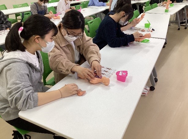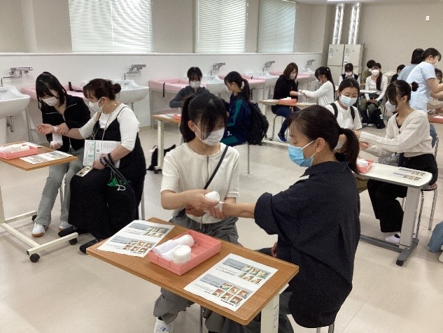 看護体験では、包帯法の講義と包帯の実技、人体模型を組み立てる学習、実習室でベッドからストレッチャーへの移乗や車椅子の体験など、3つのブースでの体験を順番に行いました。