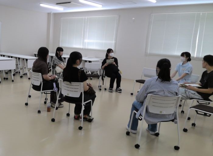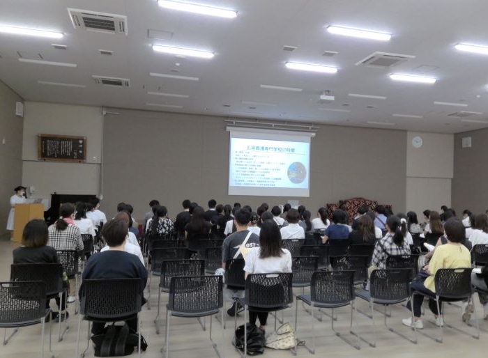 令和7年7月6日(日曜日)、令和8年度に入学を希望する方へ向けた、第1回学校説明会を開催しました。猛暑にも関わらず、高校生から社会人まで幅広い年齢層の参加があり、二部構成で実施しました。第一部では、田野章子副校長より、広尾看護専門学校の特徴、教育課程や学校生活、入試、修学資金制度など、全体説明を行いました。第二部では、参加者が自由に学校の中を周り、体験講義や懇談会、模擬病棟での展示、教員による個別相談等に参加しました。学生が作成した校舎マップを見ながら、学校の中を散策する参加者の姿が見られました。今年度より教育のDX化の一環として導入している教育用電子カルテや電子書籍の展示も行い、実際に手に触れてもらい、関心を持っていただいたようです。