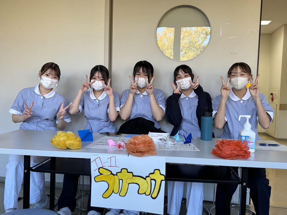 各教室の展示には、妊婦体験や車椅子の試乗など、看護学生ならではの体験型ブースがあり、実習や授業で身につけた知識・技術を活かし、成果を楽しみながら発揮できるような場となり、またお互い共有できる場ともなりました。来場者の方にも一人ひとりに寄り添いながら丁寧に対応する姿が見られ、看護の実際の現場を身近に感じていただける機会となっていたと思います。他にも、わなげや献血ブース、お昼にはお弁当やお菓子の販売などがあり、有意義で盛り上がった学校祭となりました。