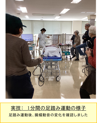 実習では、初めて聴診器を手に取り、自分のお腹に当てて腸の動く音を聞く体験をしました。はじめは腸の音を聞き取るのが難しかったものの、1分間の足踏み運動をした後に再度聴診すると、「さっきよりもはっきり聞こえる。」と驚きや感動の声が上がりました。教員がまとめとして、「大便は生活習慣、特に食事・運動・ストレス・睡眠の成果が反映された“身体からのラブレター”です。」と伝えると、深く頷き、納得していました。